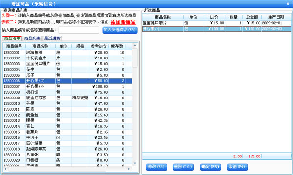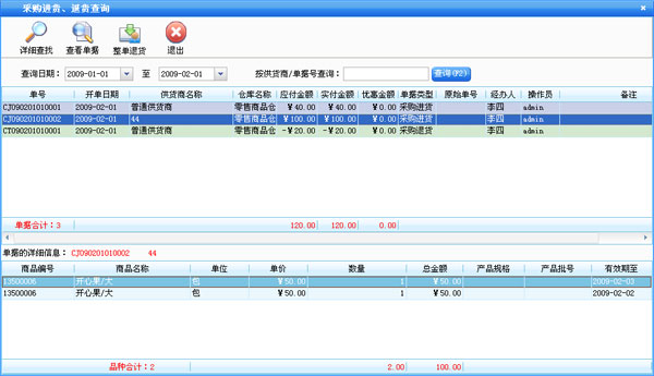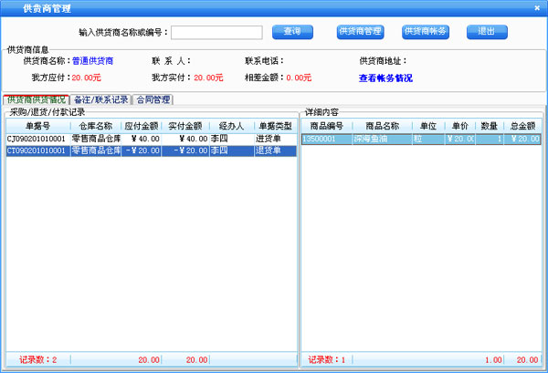 进货管理:进行商品采购入库,采购退货,进/退单据和当前库存查询,与供货商的往来帐务。