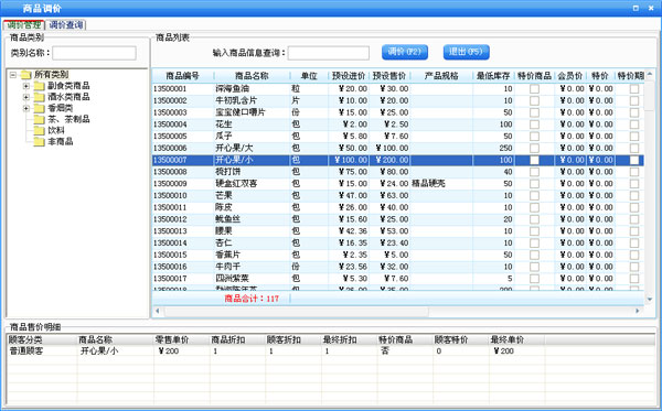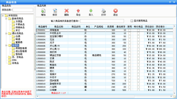 在商品信息窗口中左边是商品类别,右边列表中是该类别对应的商品。在某一类别上点击鼠标右键,可以新增类别,重命名和删除类别。新增的类别是属于所选类别的下一级,如果类别下有商品存在则该类别是不能被删除的。在类别名称后的文本框中可以输入类别名称或类别简码来查询需要的类别。