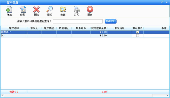 在基本设置模块中点击“客户信息”按钮打开客户信息窗口如图6。在窗口中可以看到所有的客户。点击“增加”按钮打开增加客户窗口,输入客户的信息,客户名称不能重复。如果该客户有期初金额则在“期初应收”后输入相应金额。如果选择中“默认客户”在商品业务和顾客退货打开窗口的时候显示的为该客户,默认客户只能有一个。点击“修改”按钮可以修改选中的客户信息。如果该客户有业务发生则不能修改期初应收金额。点击“删除”按钮可以删除选中的客户,如果该客户有业务发生则不能删除。系统有一个“普通客户”是不能被删除的。点击“查找”按钮打开客户查询窗口,输入相应的条件查询不同的客户信息。点击“全部”按钮可以列出所有的客户信息。 |
