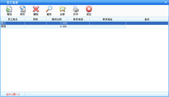 在基本设置模块中点击“员工信息”按钮打开员工信息窗口如图7。在窗口中可以看到所有的员工。点击“增加”按钮打开增加员工窗口,输入员工的信息,员工名称不能重复。点击“修改”按钮可以修改选中的员工信息。点击“删除”按钮可以删除选中的员工,如果该员工有业务发生则不能删除。点击“查找”按钮打开员工查询窗口,输入相应的条件查询不同的员工信息。点击“全部”按钮可以列出所有的员工信息。 |