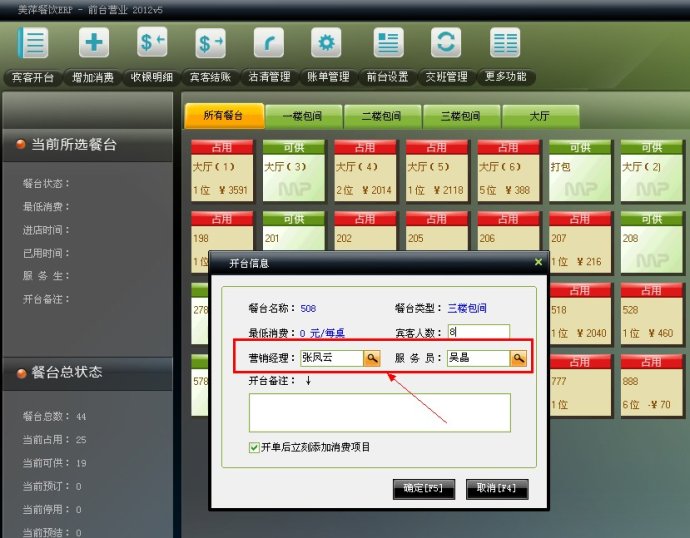 开一个餐台,可以看到红色长方形框选的,有营销经理、服务员,他们的右侧有个选项按钮可以选择本桌客人的营销经理和服务员。(图中展示的是张凤云拉来的客户,吴晶进行接待)