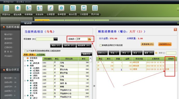 用美萍餐饮ERP管理软件的前台营业界面直接点菜如上图,只要选中相应的服务员即可,如果是另外的一个促销员又推销了一款可以提成的酒水或者菜品只需要选中相应的服务员即可。【用美萍餐饮点菜宝、或者美萍ipad/android点菜,系统会绑定为顾客点菜的服务员的点菜宝,统计起来更方便】(图中展示,最后一道菜是由王婷推销出去)