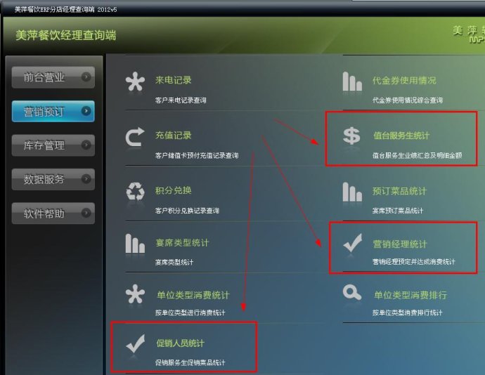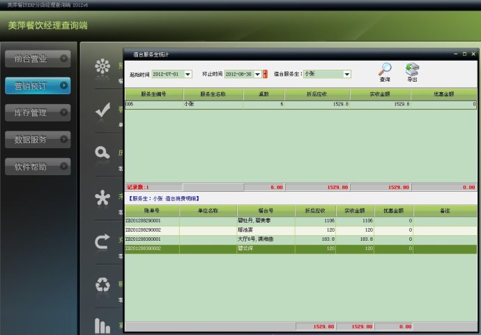 最后,是促销员、营销经理、值台服务生的业绩表汇总统计,统计功能在经理查询的营销预定模块。如下图: