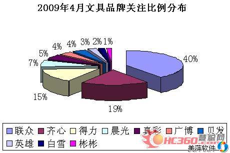 相对于得力的低迷,本月联众可谓表现良好,不但得到了品牌关注度的头名,而且斩获了高达40%的关注度比例。齐心文具表现与上月持平,依然排在第二位。