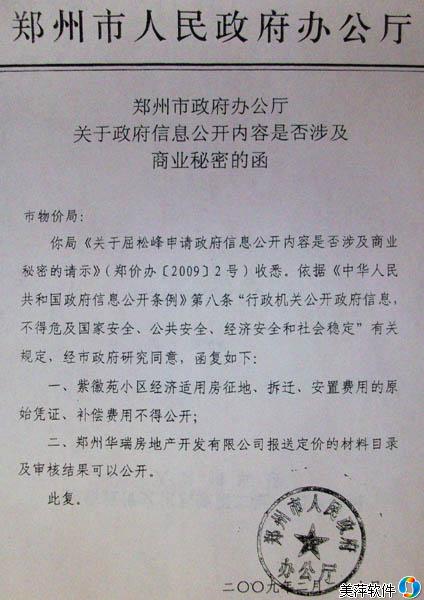 被告方郑州市物价局的代理律师表示,郑州市物价局做出不公开经济适用房成本相关详细信息的行为依据是<郑州市政府办公厅关于政府信息公开内容是否涉及商业秘密的函>,此文件由郑州市人民政府办公厅依据《中华人民共和国政府信息公开条例》制定。