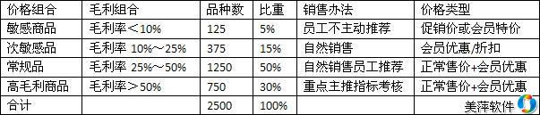 价格策略的制定主要依据是公司的经营定位及品类角色,同一商品因零售商的定位可能会被赋予不同的品类角色,而不同的品类角色则不宜进行价格竞争。全面跟价目前是很多零售商的价格策略,可如果用自身的便利性品类与对方的目标性品类进行价格比拼,无异于以卵击石,所以要求我们设计出自身商品的价格类型组合。在一个经营着2500个商品的社区药店,一般会采取以下原则规划各门店的商品价格类型组合,以作参考。(见下表)