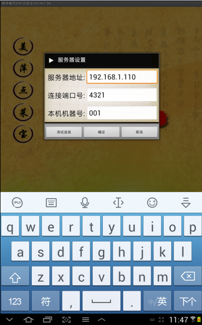 | 2、 打开软件,在登录界面,按平板电脑上的菜单键,设置服务器地址与端口号 |