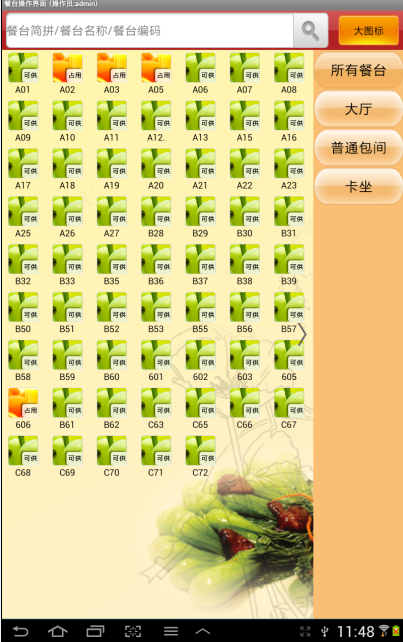 | 3、餐饮主界面,在餐饮的主界面,显示餐台的状态信息,可以点击餐台类型更改餐台的显示类型 |