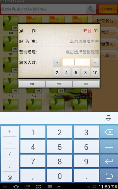 | 4、开台操作,在主界面,点击可供餐台,会弹出开台窗口,可选择服务生,输入宾客人数,点确定完成开台,或是点点菜按钮,直接打开点菜窗口 |