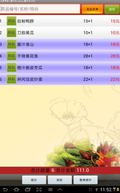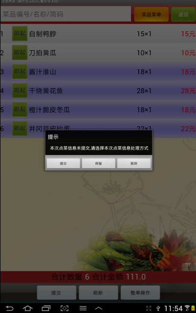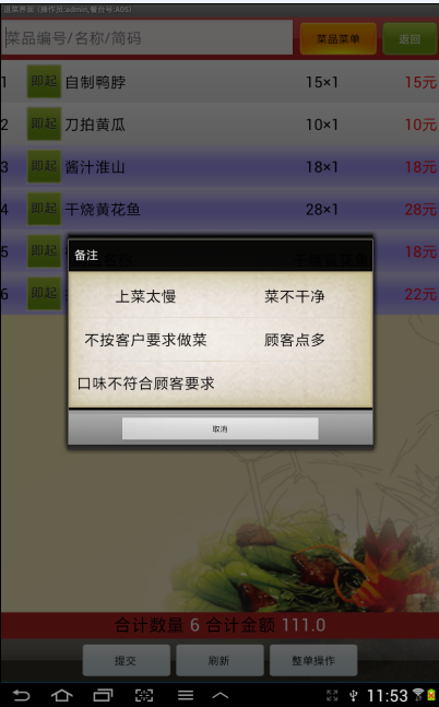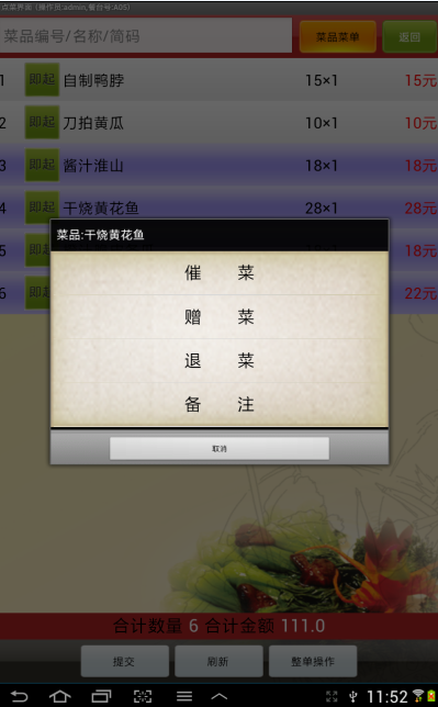 | 7、在已点菜品列表中,有两类菜品,一类是已提交菜品,一类是刚点菜还未提交菜品,已提交菜品点击会出现催菜,退菜功能项,催菜功能在后台会打印后厨单,退菜会弹出退菜窗口,选择退菜数量与退菜原因,点确定完成退菜,未提交菜品点击会出现催菜,删菜功能,删菜功能会把已点但未提交的菜品直接删除 |