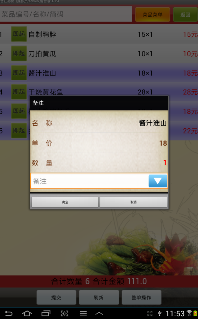 | 6、点菜界面,点菜品菜单,或是通过搜索选择要点的的菜品,会弹出点菜界面,在此界面中,可设置菜品单价(必须为时价菜),输入要点的菜品数量,选择提成服务生(菜品支持提成),选择或输入菜品备注信息,点确定,即可成功点菜 |