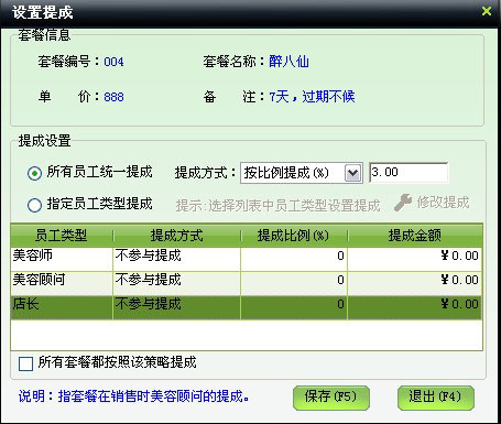 | 包括两项,储值卡充值和套餐充值。充值可以赠送金额,可以选择员工进行提成。 | |
