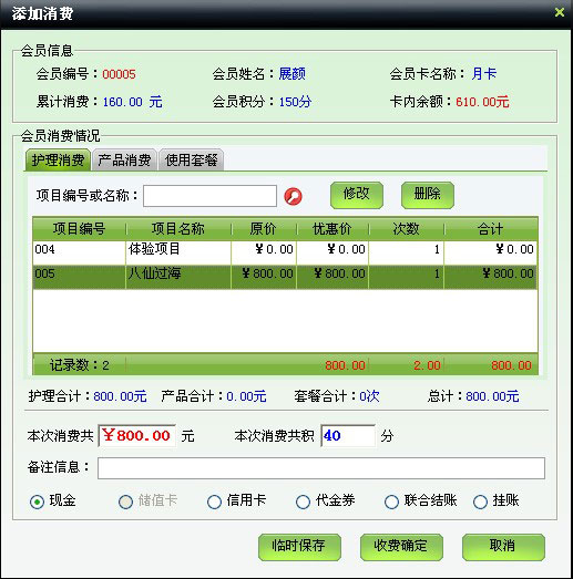| 一次消费可以包括服务(护理)、产品、套餐三种,可为每一项添加服务人员和床位,结账后计算提成。付款方式非常方便,现金、信用卡、代金券等常见结算方式都有。 | |