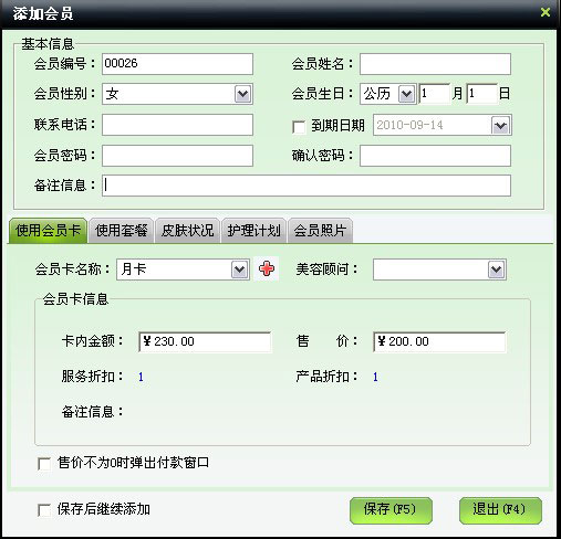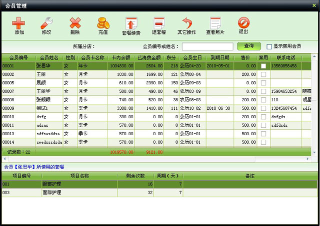 | 包括会员基本信息、本卡售价、业务员工、使用套餐、皮肤状况、护理计划、会员照片等信息 | |