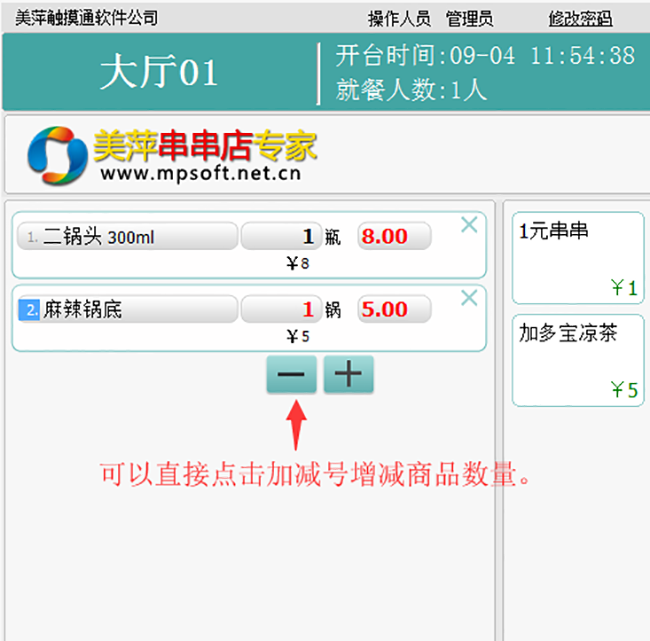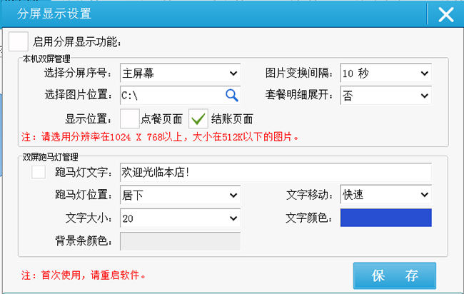 | 16.双屏管理:业务管理→双屏设置,可以让顾客面对的屏幕显示广告画和广告语,还有消费账单。 |