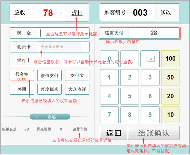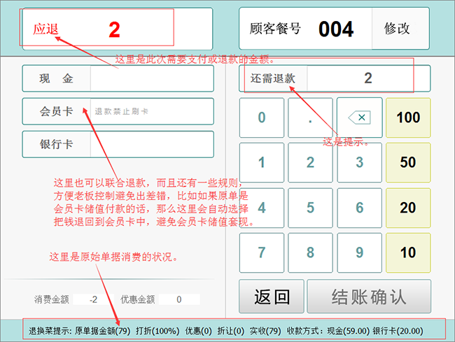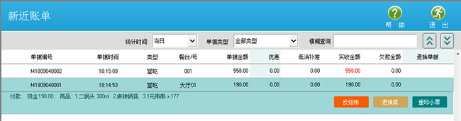 | 3.退换菜操作:只有堂吃和外卖收过款后才能在新近账单的单据中进行此操作。 |