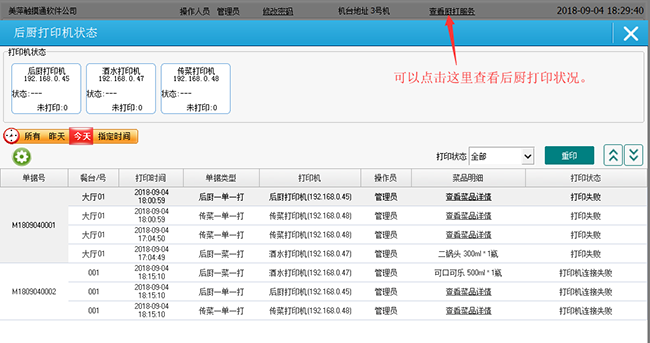 | 3.后厨打印状态:前台可以随时掌控厨房打印机的运行状况。 |