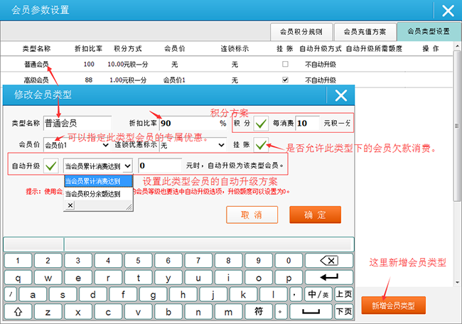 | 9.会员类型和充值方案设置:系统管理→会员类型设置和会员充值方案 |