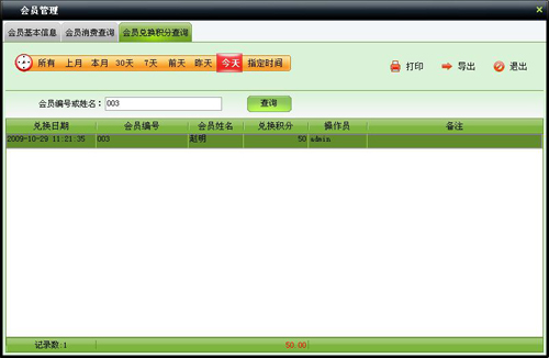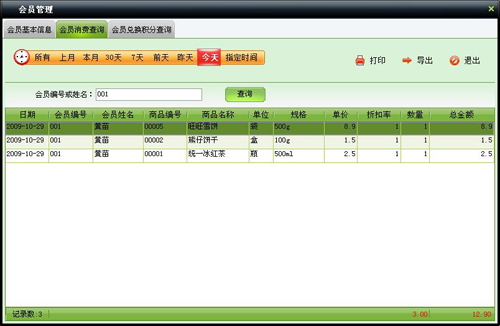 用来查询某段时间内会员消费明细情况,可以按照会员编号、姓名、姓名简码查询。点击“打印”按钮,可以打印出表格内容;点击“导出”按钮,可以把表格数据导出为Excel文件。
