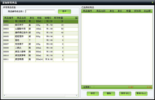 3.2.5、删除商品:通过'↓'或'↑'键来选择列表中要删除的商品,按删除商品的快捷键Del,就可以从业务列表中删除该商品;如果要清除列表中所有商品,则按全部删除快捷键End。