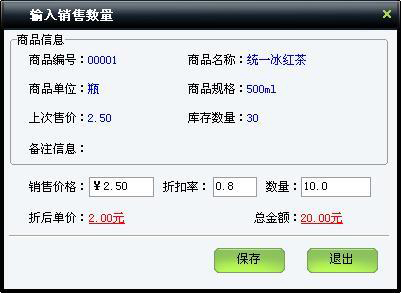 输入商品折扣,其中折扣率1代表没有折扣,按原价业务;0.8代表8折。按Enter键或按快捷键F6或点击“单个折扣”按钮即可修改该商品折扣率。如果要修改业务列表中所有商品的折扣,则输入折扣率后,按快捷键F7或点击“全部折扣”按钮,就把全部商品的折扣率都修改了。