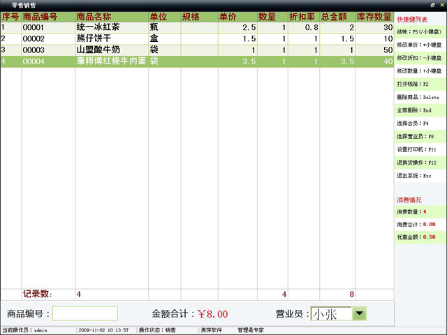 窗口右下角显示当前消费情况,包括消费数量、消费金额和优惠金额。