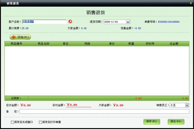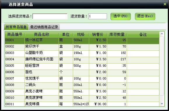 分两页显示商品信息,第一页显示所有商品信息,第二页显示更近业务商品记录,在选择退货商品文本框可以输入商品编号、名称、名称简码、条码查询,选中要退货的商品,输入退货数量,点击“选中”按钮或按快捷键F9或直接在表格上双击该商品,则商品就会添加到零售业务列表中,其单价和金额为负值。