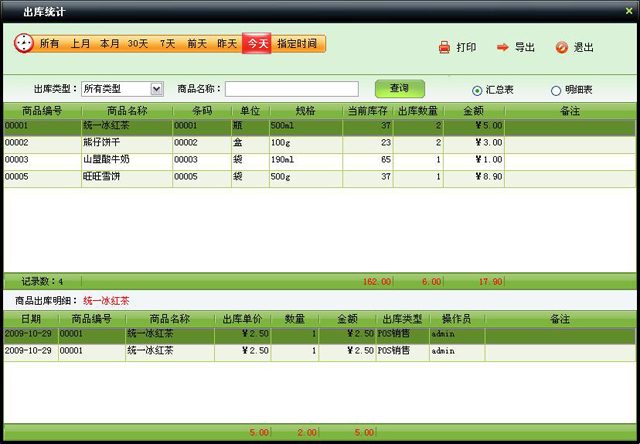 窗口打开默认显示当天数据,有四种统计方式:单据表、汇总表、明细表、业务统计图。