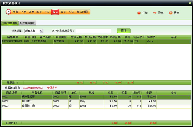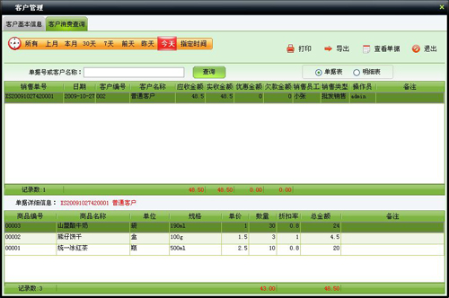 查询某段时间内客户消费情况,包括批发业务和业务退货。窗口打开默认显示当天数据,有两种统计方式:单据表、明细表。