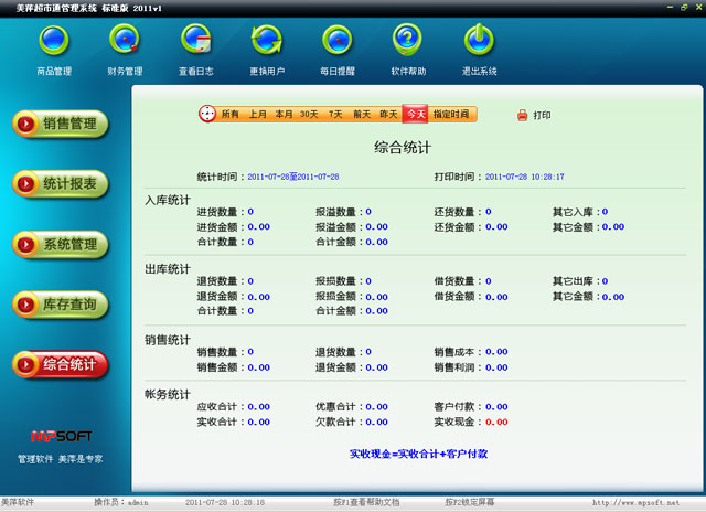 综合统计:统计某段时间内商品入库、出库、业务及帐务情况。