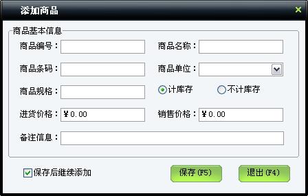 在商品基本信息部分输入新增商品的所有信息,输入完毕后,点击“保存”按钮,即把商品保存至列表中,若选中“保存后继续添加”选项,则保存后窗口不关闭,可以继续输入下一商品,否则保存后该窗口自动关闭。