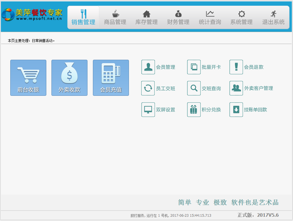 | 1.堂吃点餐消费:从系统主界面→前台收银 |