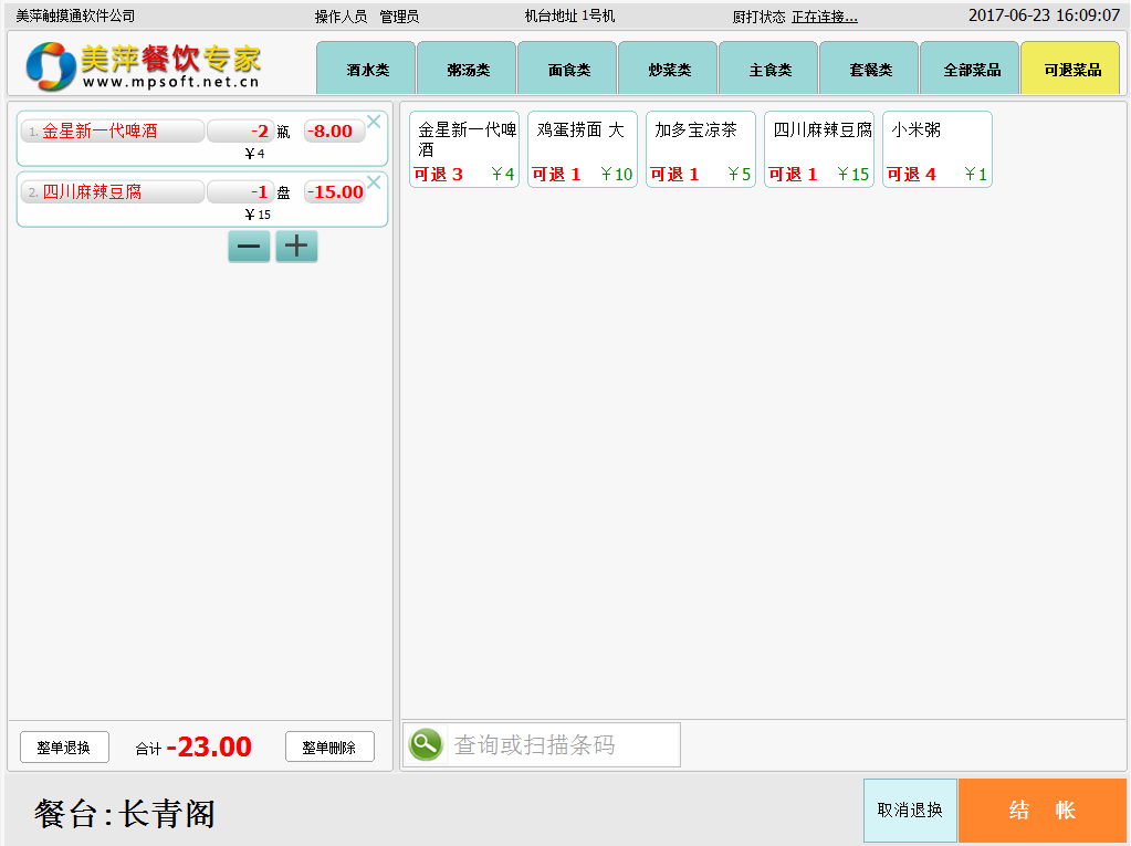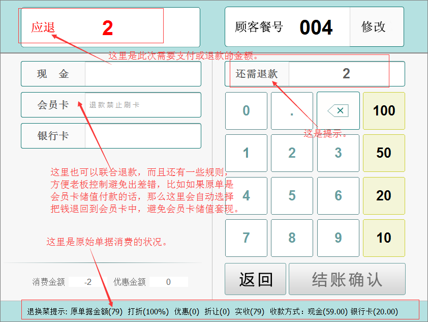 | 3.退换菜操作:只有堂吃和外卖收过款后才能在新近账单的单据中进行此操作。 |