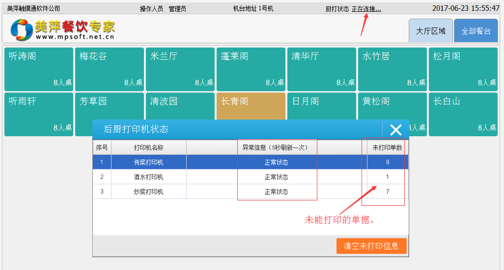 | 3.后厨打印状态:前台可以随时掌控厨房打印机的运行状况。 |