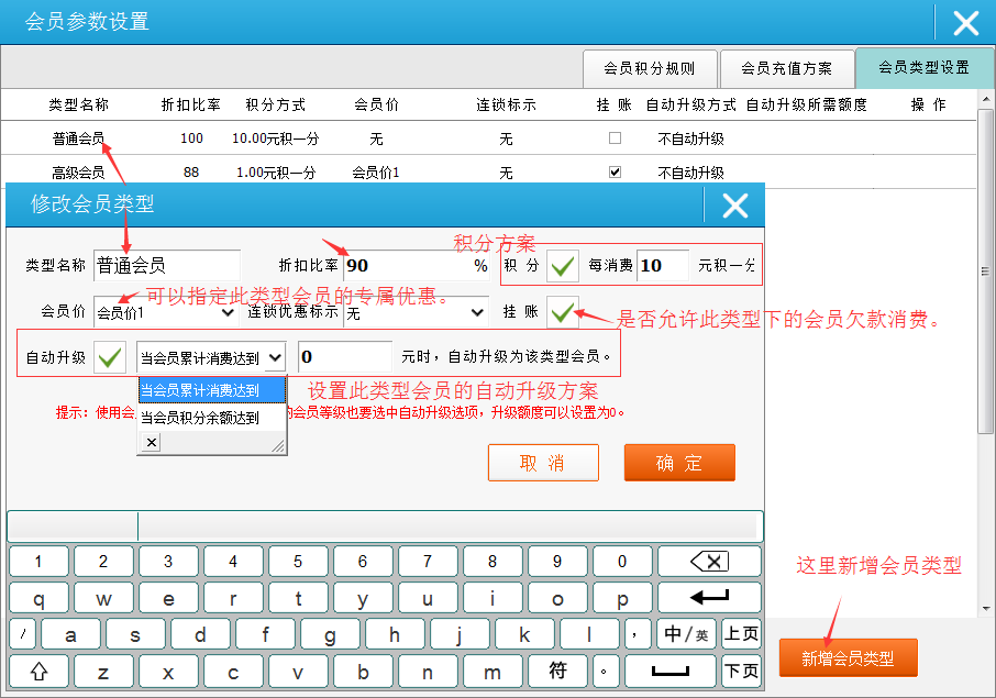 | 9.会员类型和充值方案设置:系统管理→会员类型设置和会员充值方案 |
