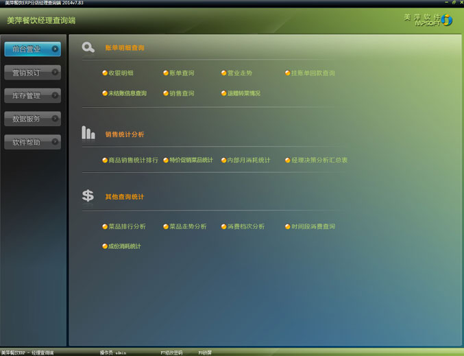 美萍餐饮管理系统是美萍公司推出的一款专业的餐饮管理软件(餐饮收银系统,餐饮收银软件),它集前台收费系统,员工管理系统,会员管理系统等强大功能为一身,系统界面简洁优美,操作直观简单,无需专门培训即可正常使用。美萍餐饮