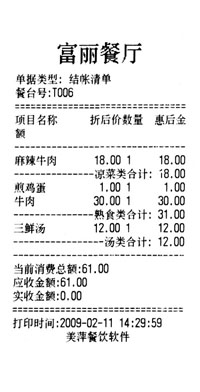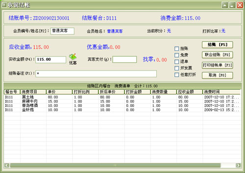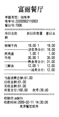 备注: 这个图标旁边的文字,鼠标经过时会有对应的图片弹出。主要功能: 1.台位管理, 快速开单 , 餐台状态 管理2. 消费点单管理 ,可随时修改变更3. 收银结帐管理 , 支持联合结帐 ,支持 多种支付以及免单和欠单![]() 4.前台小票打印,可打印 后厨单 、 催菜单 、 退菜单 、 预结单 、 结帐单![]() 5. 预订管理 ,可管理多种预订方式,支持多次预订6. 会员管理 ,只支持折扣卡类型的会员卡7.综合的营业统计查询。 门店版主要目的是简化操作,只提供更常用如营业计费,小票打印等基本功能,如果发现缺少您需要的功能,您可以了解一下美萍餐饮管理系统标准版,在门店版的基础上实现更细化的管理需求) |