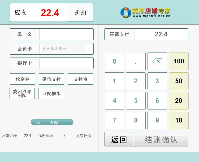 | 13.双屏管理:业务管理→双屏设置,可以让顾客面对的屏幕显示广告画和广告语,还有消费账单。 |
