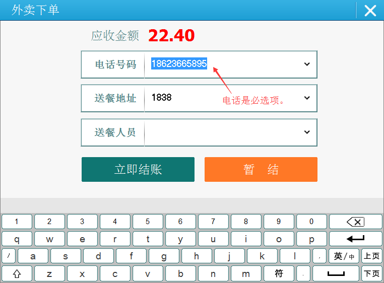 | 2.外卖点餐消费:菜品选择和堂吃一致,不同的是结账需要点击外卖暂结按钮。 |