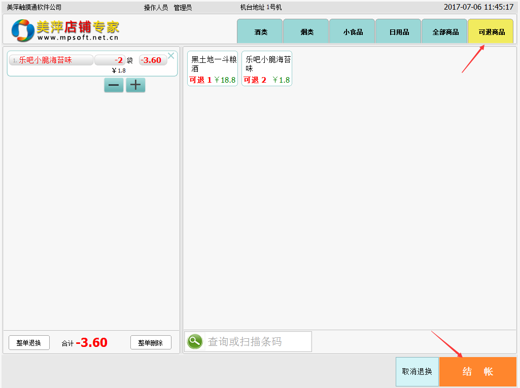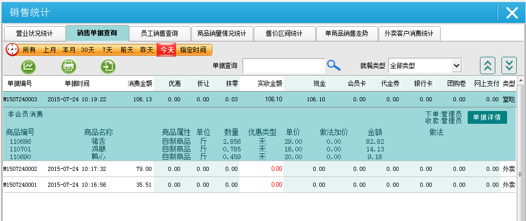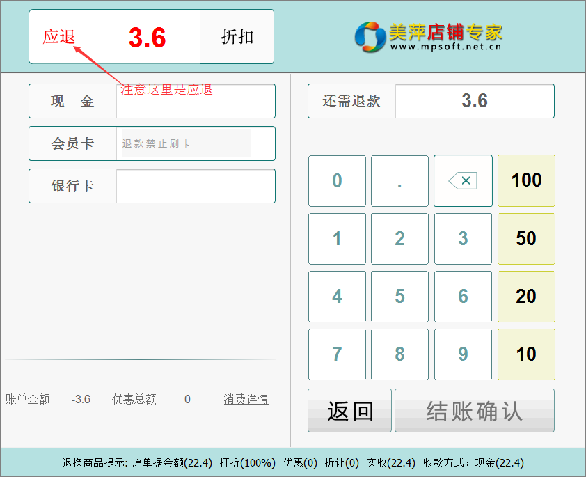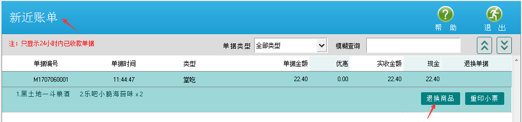 | 3.退换菜操作:只有堂吃和外卖收过款后才能在新近账单的单据中进行此操作。 |