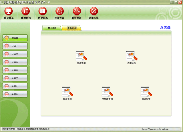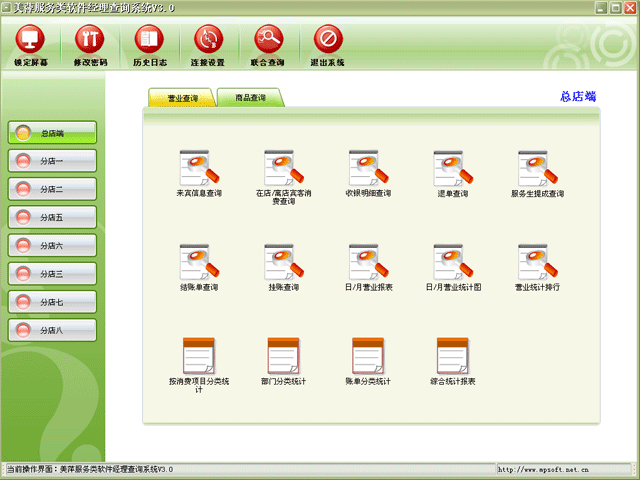 | 美萍服务类软件系统连锁店版采用先进的VPN技术及虚拟专用网进行安全连接,实现领导层实时进行各分店的营业情况进行查询分析。支持设置多个分店,领导层只需点击相应分店,即可查询对应分店的实时营业情况,此查询系统分为三大模块: |