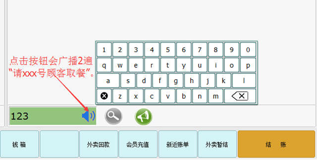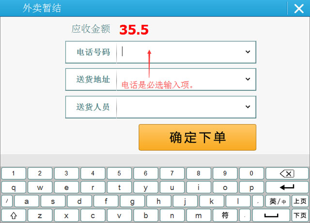 | 2.外卖点餐消费:菜品选择和堂吃一致,不同的是结账需要点击外卖暂结按钮。 |