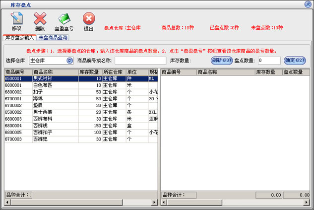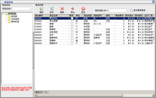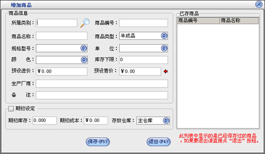 在商品信息这一部分输入新增商品的所有信息,点击“保存”按钮即可把该商品保存到右边的已存商品中,保存后可以继续输入下一种商品。在“已存商品”中可以点击鼠标右键对选中的商品进行删除或删除全部已存的商品。如果商品增加完后可以直接点“退出”按钮。退出增加商品窗口后会在商品列表中看刚才增加的商品。如果要修改商品,先选中要修改的商品,点击“修改”按钮打开商品修改界面,在商品修改界面中修改相应的信息点击“保存”即可。点击“删除”按钮即可以把选中的商品删除,该商品发生过业务则是不能删除的。