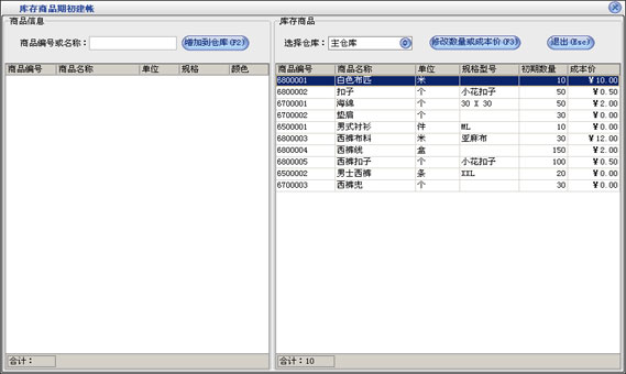 在窗口中的商品信息中可以看到所有已经增加过的商品信息,在右边的库库商品中选择仓库,可以看到该仓库中的商品。在商品信息中可以选择中一种商品点击“增加到仓库”在出现的窗口中输入期初数据和成本价,这样就可以建立该商品在指定仓库的初期帐。