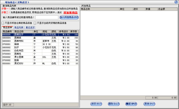 在窗口中可以看到红的为单号,单号由四部分组成如CJ050511010001,前两位“CJ”是采购进货单据的标志,“050511”是05年5月11号增加的单据,“01”为当前操作员的编号,“0001”是流水帐号。如果设置的有默认供货商,则该窗口打开的时候“供货商名称”后显示的就是该默认供货商,具体设置参见供货商设置。如果设置的有默认仓库,则该窗口打开的时候“仓库名称”后显示的就是该默认仓库。如果在“系统设置”中选中了“进货或业务时有原始单号”选项时,在打开的进货窗口中的右下角会出现原始单号。点击“增加商品”按钮出现增加商品窗口如图15。