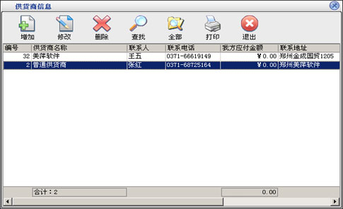 在基本设置模块中点击“供货商信息”按钮打开供货商信息窗口如图5。在窗口中可以看到所有的供货商。点击“增加”按钮打开增加供货商窗口,输入供货商的信息,供货商名称不能重复。如果该供货商有期初金额就在“期初应收”后输入相应的金额。如果选择中“默认供货商”在采购进货和采购退货打开窗口的时候显示的为该供货商,默认供货商只能有一个。点击“修改”按钮可以修改选中的供货商信息。如果该供货有业务发生,则不能再修改期初实付金额。点击“删除”按钮可以删除选中的供货商,如果该供货商有业务发生则不能删除。系统有一个“普通供货商”是不能被删除的。点击“查找”按钮打开供货商查询窗口,输入相应的条件查询不同的供货商信息。点击“全部”按钮可以列出所有的供货商信息。 |