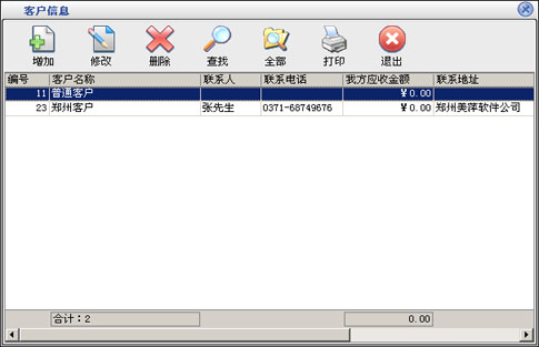 在基本设置模块中点击“客户信息”按钮打开客户信息窗口如图6。在窗口中可以看到所有的客户。点击“增加”按钮打开增加客户窗口,输入客户的信息,客户名称不能重复。如果该客户有期初金额则在“期初应收”后输入相应金额。如果选择中“默认客户”在商品业务和顾客退货打开窗口的时候显示的为该客户,默认客户只能有一个。点击“修改”按钮可以修改选中的客户信息。如果该客户有业务发生则不能修改期初应收金额。点击“删除”按钮可以删除选中的客户,如果该客户有业务发生则不能删除。系统有一个“普通客户”是不能被删除的。点击“查找”按钮打开客户查询窗口,输入相应的条件查询不同的客户信息。点击“全部”按钮可以列出所有的客户信息。 |
