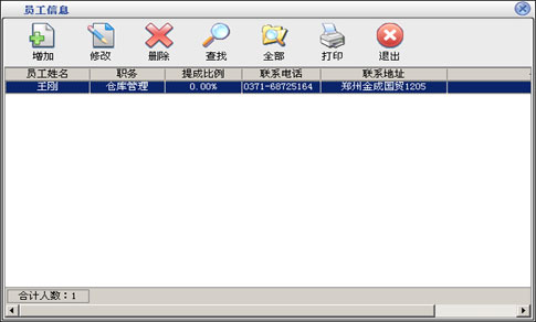 在基本设置模块中点击“员工信息”按钮打开员工信息窗口如图7。在窗口中可以看到所有的员工。点击“增加”按钮打开增加员工窗口,输入员工的信息,员工名称不能重复。点击“修改”按钮可以修改选中的员工信息。点击“删除”按钮可以删除选中的员工,如果该员工有业务发生则不能删除。点击“查找”按钮打开员工查询窗口,输入相应的条件查询不同的员工信息。点击“全部”按钮可以列出所有的员工信息。 |