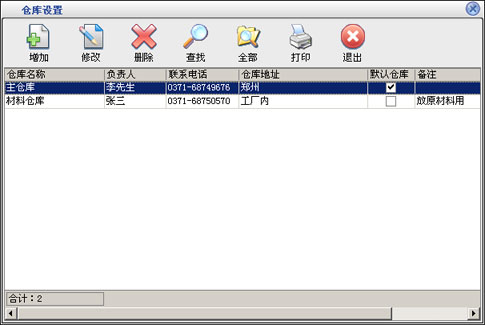 在基本设置模块中点击“仓库设置”按钮打开仓库设置窗口如图8。在窗口中可以看到所有的仓库。点击“增加”按钮打开增加仓库窗口,输入仓库的信息,仓库名称不能重复。如果选择中“默认仓库”在所有单据打开窗口的时候显示的为该仓库,默认仓库只能有一个。点击“修改”按钮可以修改选中的仓库信息。点击“删除”按钮可以删除选中的仓库,如果该仓库有业务发生则不能删除。点击“查找”按钮打开仓库查询窗口,输入相应的条件查询不同的仓库信息。点击“全部”按钮可以列出所有的仓库信息。