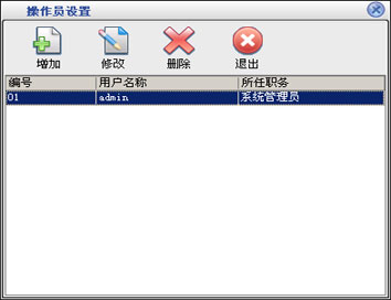 在基本设置模块中点击“操作员设置”按钮打开操作员设置窗口如图9。在窗口中可以看到所有的操作员。点击“增加”按钮打开增加操作员窗口,输入操作员的信息,操作员编号、操作员名称不能重复。点击“修改”按钮可以修改选中的操作员信息。点击“删除”按钮可以删除选中的操作员。“admin”操作员为超级管理员,有所有的权限,该管理员不能被修改和删除。